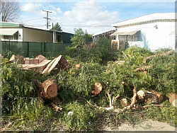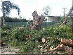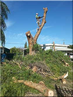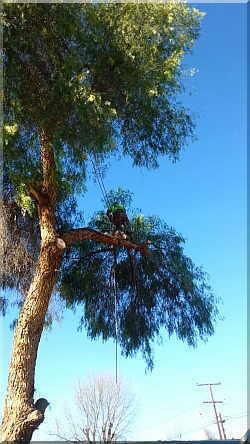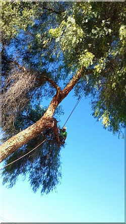 A SkyHook climber removing an old and unruly Pepper Tree: